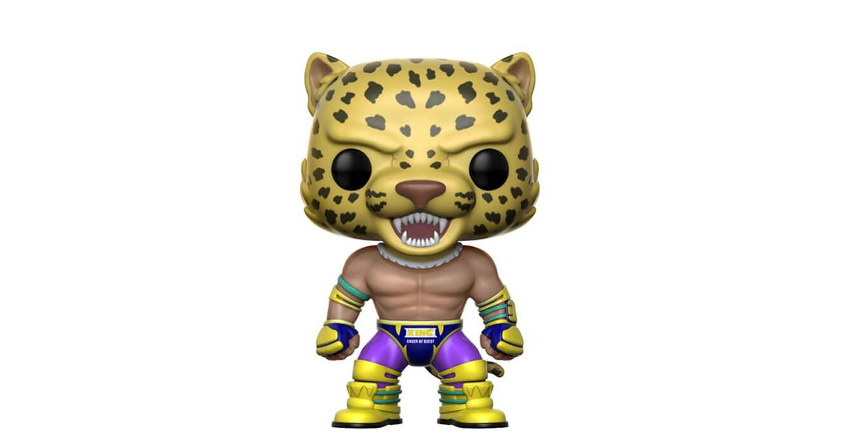 Tekken King is one of the fighters of the video game Tekken. Appeared in Tekken 3, he is a Mexican wrestler with a big heart. His goal? To win the King of Iron Fist Tournament to pocket the coquette sum of money and provide for the financial needs of his orphanage.This fighter is special for several reasons: he fights wearing a jaguar mask, his discipline is a little further away from martial arts sports and his catches are generally very spectacular.In the history of Tekken, there have been several Kings. King II whose figurine is the object initially participates in the tournament to avenge his mentor, killed by the Ogre.Professional wrestler, Tekken King has an impressive physique: 2m for 90kg! The POP figurine with his effigy takes the features of the wrestler in his classic outfit. He stands with his fists clenched, his jaguar mask on his head, his flashy purple pants and his blue briefs over his pants. Very few accessories or weapons are depicted, as wrestling does not require them. King therefore has only his hand and leg protectors.Note: there are different figurines of King representing him in other outfits according to Tekken's opus, including the POP of Tekken King wearing his cape!