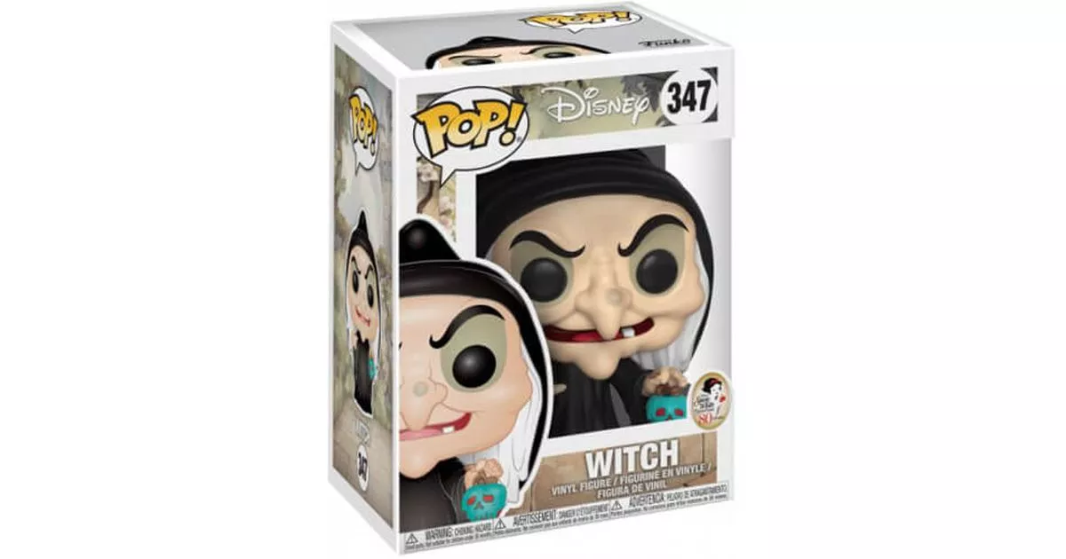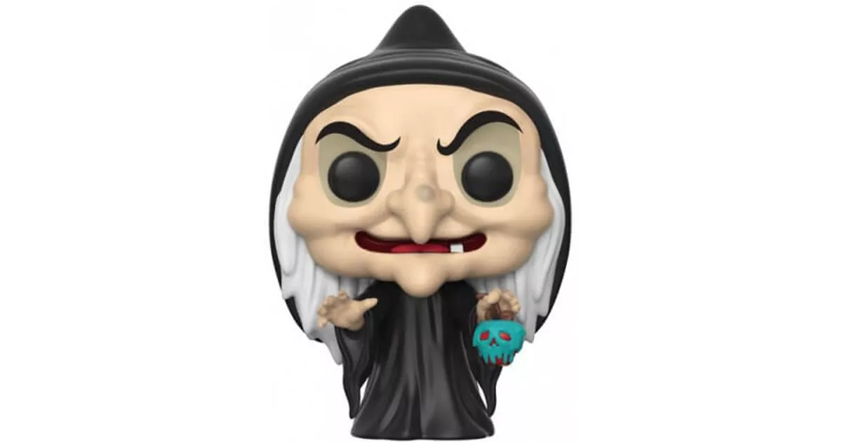 The witch is one of the evil characters in the Disney cartoon, Snow White and the Seven Dwarves. The animated film, adapted from the Grimm brothers' tale, tells the story of Princess Snow White who finds herself living with her stepmother after her father's death. The queen is jealous of the princess' beauty and treats her with contempt. She finds herself wearing rags and doing household chores.Highly narcissistic and obsessed with being the most beautiful in the kingdom, the queen has a magic mirror to which she asks every day who is the most beautiful. The mirror always answers that she is the most beautiful until the day Snow White's beauty surpasses that of the queen. The queen, furious, asks her hunter to kill him and bring the princess' heart in a box. But the hunter spares Snow White and warns her of the danger posed by her mother-in-law. Snow White flees into the forest and takes refuge with the seven dwarves.When the queen discovers that she is still not the most beautiful woman in the kingdom, she understands that Snow White has not been killed and decides to take care of her. She consults a grimoire and finds a formula to transform herself into a scary and ugly old woman so that no one suspects her true identity. She then looks for a way to kill the princess and while flipping through her grimoires, she comes across a formula to concoct a poisoned apple: the victim will fall into a deadly sleep as she bites into the apple.The witch then goes in search of the princess and takes advantage of her naivety to manipulate her. Snow White bites into the poisoned apple and falls into an eternal sleep. Warned by the animals of the forest, the dwarves arrive but it is too late. They cross the witch and run towards her. Trapped, the old lady finds herself at the top of a rocky mountain and ends up falling into the precipice, struck by lightning.Physically, the witch is the opposite of the queen: a little old woman, wrinkled, with white hair and a long hooked nose. She has a wart on her nose and a broad chin. Her eyes are green with thick eyebrows. On this Pop figurine, we recognize all the physical characteristics of the character: the long hooked nose with wart, chin, green eyes and white hair. She wears a Machiavellian smile that reveals a tooth. On the clothing side, she wears a black coat with a hood. In her hand is a poisoned apple covered with a substance that draws a skull and crossbones, which she has just dipped in her cauldron.