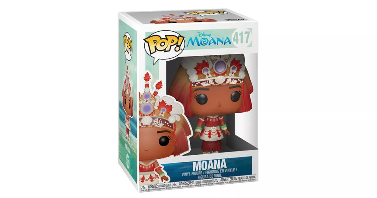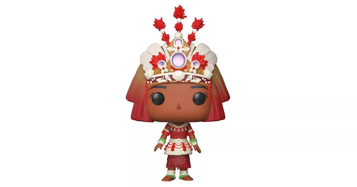 Moana is the daughter of a Polynesian tribal chief from the island of Motuini. She is the heroine of the Disney cartoon Moana (Vaiana in French). This animated film is based on a Polynesian legend according to which, several thousand years ago, the demigod Maui stole the heart of the creative goddess of the world, Te Fiti. By losing her heart, the jade stone, Te Fiti disintegrated and today her islands, including the one on which the Moana tribe lives, are dying. A millennium later, the ocean chose Moana to accomplish the mission of reuniting the goddess Te Fiti and her heart. Indeed, while she is still a baby, Moana finds herself on the beach collecting shells when the ocean retreats to let her discover the underwater life. With her little legs, Moana steps forward and picks up the jade stone shining through the wave. Unfortunately, when her father Tui grabs it and pulls it away from the water, she loses the stone.When she becomes an adult, the future chief of the tribe sees her island die: the fish and coconuts die. So she proposes to cross the reef to find food for the people. Her father forbids her because it is too dangerous. Her dying grandmother gives her back the jade stone and explains to her that it is time to fulfill her destiny. In the night, she sets sail to search for the demigod Maui, together they will face many obstacles and return the heart of the goddess Te Fiti. By returning the heart, the balance on the islands of Polynesia is restored.When she returns home, Moana takes part in the ceremony that makes her head of the tribe. She also succeeds in convincing her father that their people must return to the sea, like her sailing ancestors.For this Pop! figurine, Funko represents Moana in her magnificent ceremonial outfit. On this Pop! figure, Moana wears a double loincloth, one red and one white. The red loincloth has many Polynesian patterns with fringes. The white loincloth is shorter with white straw fringes and is decorated with red beads. Moana wears a top matching the colors of her loincloth. She has around her ankles and wrists ceremonial ornaments, flower bracelets, pearl or shell necklaces. On her head, we find her very detailed ceremonial headdress, with red and yellow fringes, white and red feathers with flowers and purple gemstones.