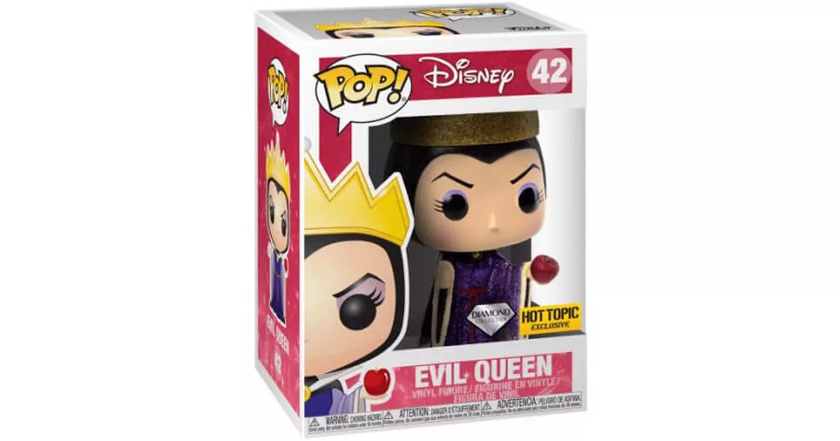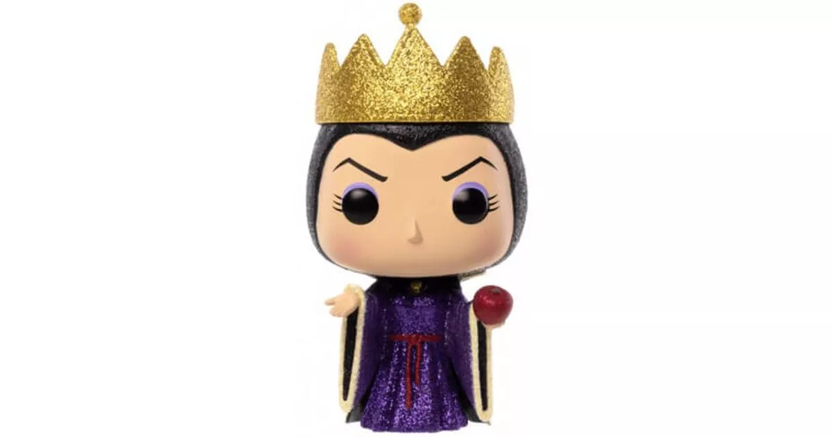 The Evil Queen is one of the main characters of the Disney cartoon Snow White. The story is about the adventures of a young princess living with her mother-in-law, the Evil Queen. Snow White's mother died giving birth to her, her father the King remarried a beautiful but cruel and vain woman. When the King died, the Queen made the Princess a servant and treated her with contempt. Very narcissistic, she asks daily who is the most beautiful in the kingdom to her Magic Mirror: "Mirror, mirror made of ebony wood, tell me, tell me that I am the most beautiful". Her mirror answered her, "Looking around, in the whole wide world, you can't find anyone more beautiful than you are." Thanks to him, she also knows everything that happens in her kingdom and governs it with an iron hand.One day, the Magic Mirror tells her that Snow White, despite her rags, has surpassed her in terms of beauty with her beautiful ebony black hair and snow-white complexion. Furious, she asks her faithful servant the hunter to kill the princess and bring her heart back to prove her death. But the hunter, unable to kill the princess, lets her escape into the forest. He kills a doe and brings her heart to the Queen.When the Queen realizes that the hunter has not killed the Princess, she takes the appearance of an old lady and goes to the cabin where Snow White has taken refuge to offer her a poisoned apple that would grant her wishes. The witch manipulates Snow White and plays on the naivety of the princess to get her to bite into the apple. Immediately, Snow White collapses and falls into an eternal sleep. The wicked witch expresses her satisfaction with a Machiavellian laugh. She dies later, struck by lightning.The evil stepmother the Queen with her witch version is one of the most famous villains of Disney. Physically, she is indeed very beautiful but is very cold and has a cruel look unlike Snow White who is very smiling, charming and pure.On this Pop figurine, Funko represents the evil Queen in the Snow White cartoon. We can find the details of her outfit in the cartoon. She is dressed in a sumptuous purple/blue dress with a red rope belt with a black cape at the collar closed by a golden jewel. This purple dress has wide sleeves with golden edges. We find the black veil that she wears on her head and that hides her hair. Her five-pointed crown is placed on her head and she wears a cruel and piercing look with her frowned eyebrows descending over her eyes. Her makeup is also reproduced in every detail on this figurine: purple/blue eye shadow and pink cheekbones. Finally, she holds in her left hand, the famous poisoned apple that she is going to offer to Snow White.