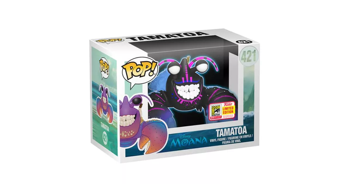 Tamatoa is a giant crab, a mythological creature that lives in the kingdom of monsters in the cartoon Moana (Vaiana) from Disney studios. Moana is inspired by a Polynesian legend that tells the creation of the islands by the goddess Te Fiti. But one day, the demigod decides to go and steal the heart of the goddess, coveted by all for her power of creation, in the hope of winning the love of men. However, by depriving the goddess of her heart, Te Fiti loses her soul and Maui causes misfortune and the destruction of all life around the island. When the curse reaches the island of Moana, daughter of the future chief Tui, Motunui's future chief, she does not hesitate to leave in search of Maui to restore the heart of Te Fiti, the jade stone given to her by her grandmother. Together, they will first go in search of the magic hook of Maui which is in the kingdom of the monsters. It is in this kingdom that appears Tamatoa, the giant crab, the oldest enemy of Maui who lives in a giant shell in the depths of the kingdom.Tamatoa is a rather pretentious and cruel character since he admits to having eaten his grandmother. He even adds with a bit of twisted humor that it took him a week to eat her because of her enormous size. He is also very narcissistic and likes to talk about himself. It is moreover by praising the character that Moana will succeed in creating a diversion while Maui gets his magic hook back, placed on his shell. They will manage to leave the monster kingdom with the famous magic hook thanks to Moana's stratagem which makes believe that she gives him the heart of Te Fiti by coating a shell with a green fluorescent substance. This small diversion allows them to escape.This figurine of Tamatoa is a glow in the dark version of the Pop! Tamatoa 421. It represents the character in the scene where he is illuminated by black light. One finds the neon colors on all his body. He is once again represented in a super-sized version with two big rough clamps in front, colored in a purple gradient with fluorescent pink stripes. His face is black with fluorescent blue and pink stripes. We can see her smile with her white teeth with small pieces of diamonds. He has big bulging eyes and typical crab antennae with pink stripes. On his shell, the golden objects of the previous figure are this time represented by a layer of light blue but we can still distinguish the magic Maui hook.
