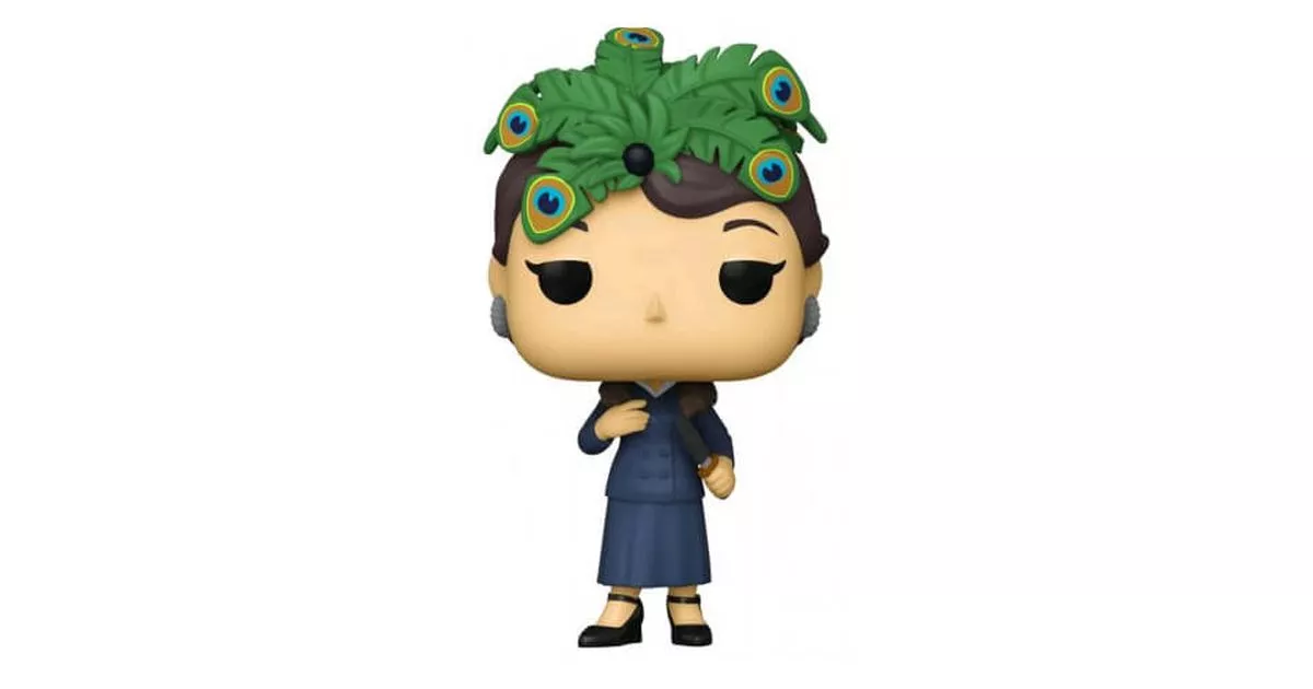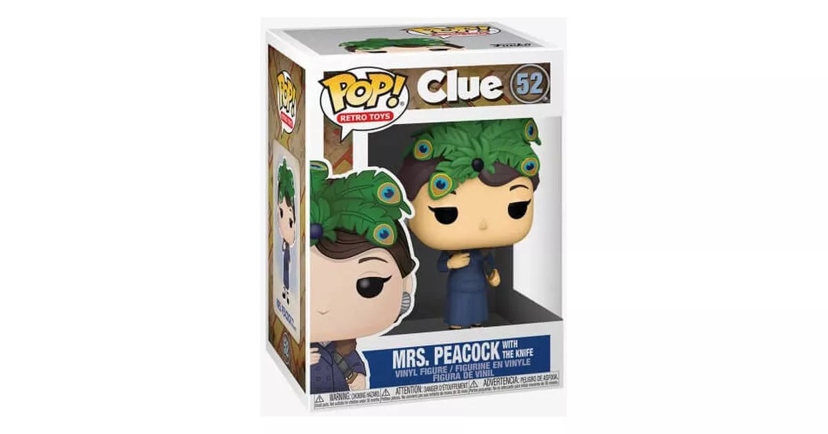 Mrs. Peacock, whose full name is Eleonore Fleur, is one of the characters in Clue. Mrs. Peacock is a respected (and feared) politician who is very influential. Close to Doctor Lenoir, she was staying in his mansion when he was murdered and is therefore, in fact, also a suspect in his murder.Mrs. Peacock is also the mother of Miss Scarlet, who was present on the evening of the assassination. Both are longtime friends of Dr. Lenoir, and do not appear to have any reason to wish him harm. Nevertheless, Mrs. Peacock is known to be a woman who cannot stand it when things do not go her way. Did she get angry with the Doctor, and did their argument result in the Doctor's death?Ambitious, manipulative, arrogant, Mrs. Peacock has many flaws that could justify her being the culprit in the murder. Isn't she willing to do anything to keep her place in society after all?Mrs. Peacock's POP is just like the character in the game Clue, since we discover a woman who is both coquettish and cold. She wears a skirt and a matching tailor's jacket, blue like the color of her character. Her coquetry can be seen on the figurine on her black heeled shoes, earrings and on the imposing brooch she has in her brown hair. The brooch recalls the patterns she sometimes wears on her dress in some editions of the game.Finally, Mrs. Peacock's POP presents her holding a knife in her left hand. Surprising since it is certainly not her who was slicing her way through the kitchen... Did Mrs. Peacock kill Dr Lenoir with the knife? That's what Funko suggests anyway!