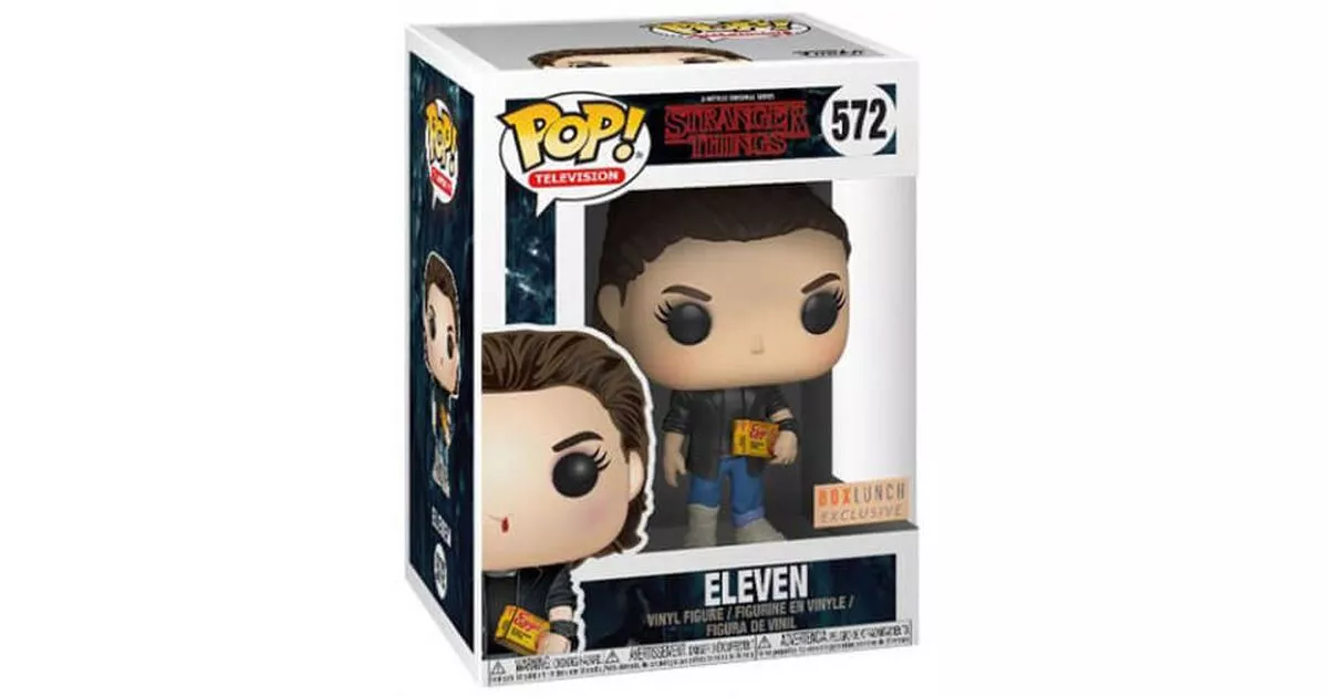 Eleven (or Eleven in VO), is the girl at the center of the mysteries of the Stranger Things series. Raised in Hawkins' laboratory by Dr. Brenner, who used her for experiments to exploit her extraordinary abilities, Eleven ran away from the laboratory after opening the breach that released the Demogorgon...This is how she meets the boys' gang and understands that she is no stranger to Will's disappearance. She even manages to get in touch with him while Will is in the upside down world. With her help, the town of Hawkins manages to get rid of the monster, but Eleven is now missing.At the beginning of season 2, it is understood that Eleven was taken in by Jim Hopper and that he hides her in his isolated cabin. Hopper has imposed strict rules to protect her, including not allowing her to leave the cabin and not allowing her to communicate with anyone other than himself. The girl is not comfortable with the situation, having only the television to open up to the outside world...While she is more and more eager to emancipate herself, Hopper continues to refuse to let her out. To preserve her, he lies to her about her mother's story and it is when Eleven discovers the reality by rummaging through a box of archives at the cabin that she decides to go in search of her mother.Eleven finds her mother in a vegetative state, but her mother manages to give her a glimpse of her past through the psychic abilities they maintain. Eleven learns that she was not alone in the laboratory and that a young girl, older than she was, was also kept as a guinea pig.Funko chose to represent Onze in an exceptional POP figurine where she was reunited with her "sister" Kali in Chicago. Kali is the leader of a gang and uses her powers to take revenge on the people who abused her in the lab. She convinces Eleven to join her vendetta and decides to give her a makeover. Indeed Eleven wears the clothes donated by Hopper and these are not really fashionable...So we find Eleven's pop in punk: blue jeans rolled up on one leg, black bandana, white shoes that go up and leather jacket form his new look! Eleven has gel in his hair, which is now completely flattened backwards, and black makeup around his eyes. The style is completely in tune with Hawkins' girl and she doesn't dislike it!Finally, in a nod to the character of Stranger Things Eleven is shown holding one of the Eggo brand waffle packs she loves in her hand. Funko has even gone so far as to represent a bleeding nose on the girl's nose, which suggests that Eleven obtained the waffles in a not very legal way and using his powers...