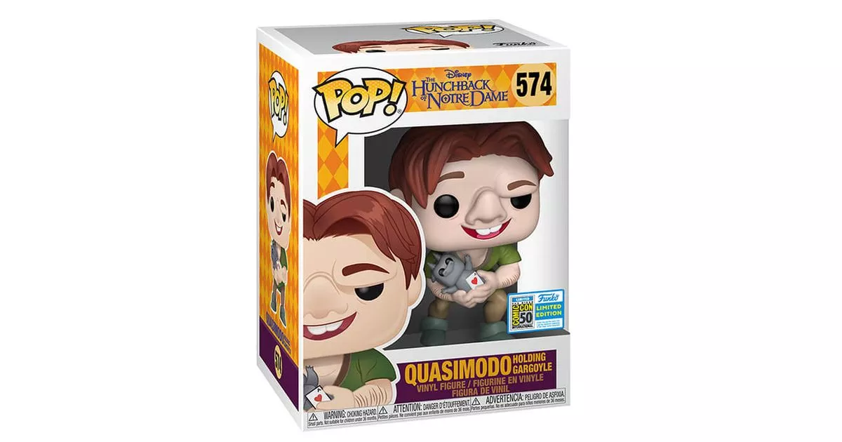Quasimodo is the hero of Disney's "The Hunchback of Notre-Dame" (and one of the main characters in Victor Hugo's novel from which the animated film is based). Quasimodo is the hunchback, a bell ringer living hidden in the heights of the cathedral.Gathered at birth by Frollo (who has just murdered his mother), he is raised by this ruthless judge and condemned to live hidden from the world so ugly. Indeed, Quasimodo doesn't have the physique of a model with his deformed face, his slumped posture and his hump on his back, but he is of a big heart and only dreams of meeting others.Engaged in a war against the gypsies, Frollo will try to capture Esmeralda, a beautiful young gypsy girl dancing in the square in front of Notre-Dame. To escape him, she takes shelter in the cathedral and meets Quasimodo, who becomes her friend and eventually protects her from Frollo, thus opposing the man he calls "Master".Quasimodo's POP figurine represents the hunchback proudly holding a gargoyle in his hand, one of his few friends. He is dressed in his green clothes: a tunic, tights and a pair of shoes for simple pageantry.Funko pays homage to the bell ringer with a magnificent figurine in which Quasimodo stands bent over. We recognize his almost red hair and his damaged face with a flattened nose and a damaged eye. His half-opened mouth nevertheless reveals a friendly and generous smile. On his back is, of course, the hump that gave its name to the hunchback of Notre Dame.
