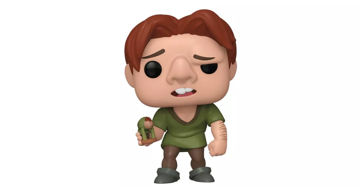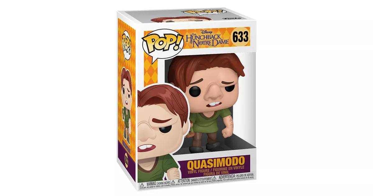 Quasimodo is the central character in the Disney film The Hunchback of Notre Dame. Based on Victor Hugo's novel "Notre Dame de Paris", the film recounts the life of Quasimodo as told by the gypsy Clopin to children using small puppets.Clopin tells how Quasimodo was taken in by Frollo and appointed bell ringer. He describes a very ugly man, frightening to children with a deformed face, standing bent over and with a large bump on his back.The story is true, and Quasimodo lives secluded in the heights of the cathedral. He only frequents Frollo who comes to visit him daily, calling him "Master" and obeying his instructions, including never to leave the cathedral. His only friends are the gargoyles and his only dream is to discover the world and the people outside.Since his birth, Quasimodo has been contemplating the show that takes place on the square in front of Notre-Dame. Especially on the day of the feast of the madmen where everyone disguises themselves and the ugliest costume is elected "King of the madmen". This year, Quasimodo breaks his master's orders and goes out to take part in the festival.Quasimodo is spotted in the crowd and ends up being elected King of Fools, he is cheered and carried by the crowd. He is given the cape, the sceptre and crowned king. When he reveals his identity, the crowd realizes that he is not wearing a disguise and that Quasimodo was born "ugly"... He is then humiliated by the crowd who reject him for his ugliness.The hunchback takes refuge in the cathedral and meets Esmeralda, a gypsy pursued by Frollo who tries to escape him. The two become friends (an unattainable love for Quasimodo that turns into a sincere friendship) to the point that Quasimodo will do anything to defend his protégée.Frollo wants to expel the gypsies from Paris and orders Phoebus to flush them out and capture Esmeralda. Phoebus will also fall under the spell of the beautiful gypsy. Using malice, Frollo will manipulate Phoebus and Quasimodo to capture Esmeralda. Quasimodo will then oppose his master to prevent his friend from being burned at the stake.For this new POP of Quasimodo, Funko has represented the Hunchback holding a toy representing himself! We find the figurine of Quasimodo where he stands rather curved and where we recognize his deformed face with his flattened nose and his swollen eye. Quasimodo is wearing his usual outfit with his tunic and green tights.This figure of Quasimodo stands out from the other POPs of the same character because it presents better the personality of Quasimodo: a young man alone, who remains locked up under the bells of Notre-Dame with only the gargoyles as his friends, even coming to play with toys made by himself and in his effigy!