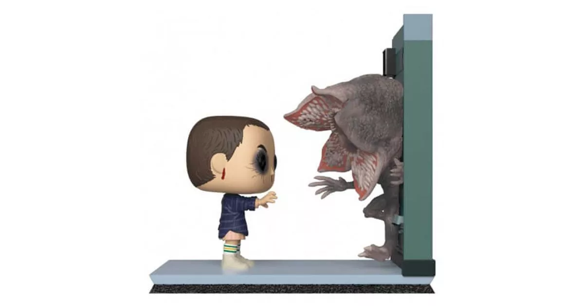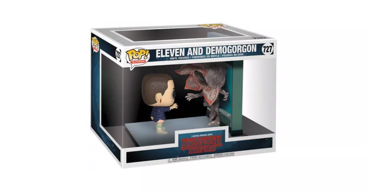 Eleven (Eleven in VO) and the Demogorgon are two of the characters of Stranger Things. She is a young girl who grew up a prisoner in Hawkins' laboratory trying to exploit her telekinetic powers while he is the monster haunting the world upside down and determined to attack the town of Hawkins...If the first episodes of season 1 of Stranger Things bring more questions than answers, one thing is sure: Eleven as well as the Demogorgon are at the center of the plot. It's easy to see why, in a failed experiment, Eleven opened a breach that allowed the creature to enter the "real" world.The stories are brought together by Mike, Lucas and Dustin who meet the girl and understand that she can help them find Will, who disappeared while cycling home... Eleven will be an even more important ally than the boys imagine. Not only does she enable them to understand the existence of the world upside down (through the help of Mr. Clarke as well!), but she also succeeds in communicating with Will and assuring them that he is alive.Funko proposes a POP Movie Moment of Stranger Things figurine, which is exceptional since it is certainly the most important scene of the first season: the fight between Demogorgon and Eleven! The scene takes place in the school grounds at the very end of the season. The children have taken refuge there while Hopper and Joyce are about to go out into the world upside down to get Will back...The Demogorgon appears by creating a breach in a classroom blackboard, and that sets the stage for this Movie Moment! So we find on the POP the painting with the creature which is almost completely out of the breach.The Demogorgon stands with its mouth open, we recognize its skeletal body, its claws on its hands and its petal-shaped head with hundreds of small teeth. In front of him, we find Eleven's POP in full use of his telekinetic powers.Eleven has her short hair, she wears the clothes Mike lent her: her sister Nancy's pink dress, the blue plaid shirt and the striped socks. Eleven faces the monster and we can see that the fight is intense since she is bleeding from her nose (as every time she uses her powers) but also from her ears. Finally, her eyes are very marked with veins that stand out incredibly.This Funko POP Movie Moment of Eleven facing the Demogorgon can become one of the masterpieces of POP Stranger Things collectors!