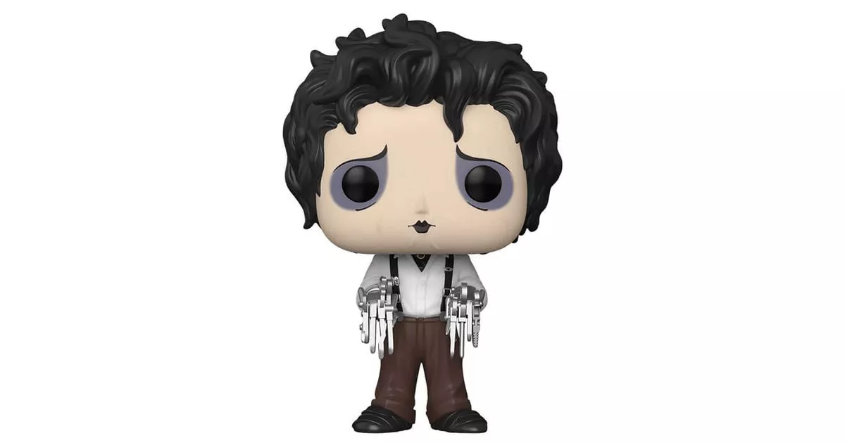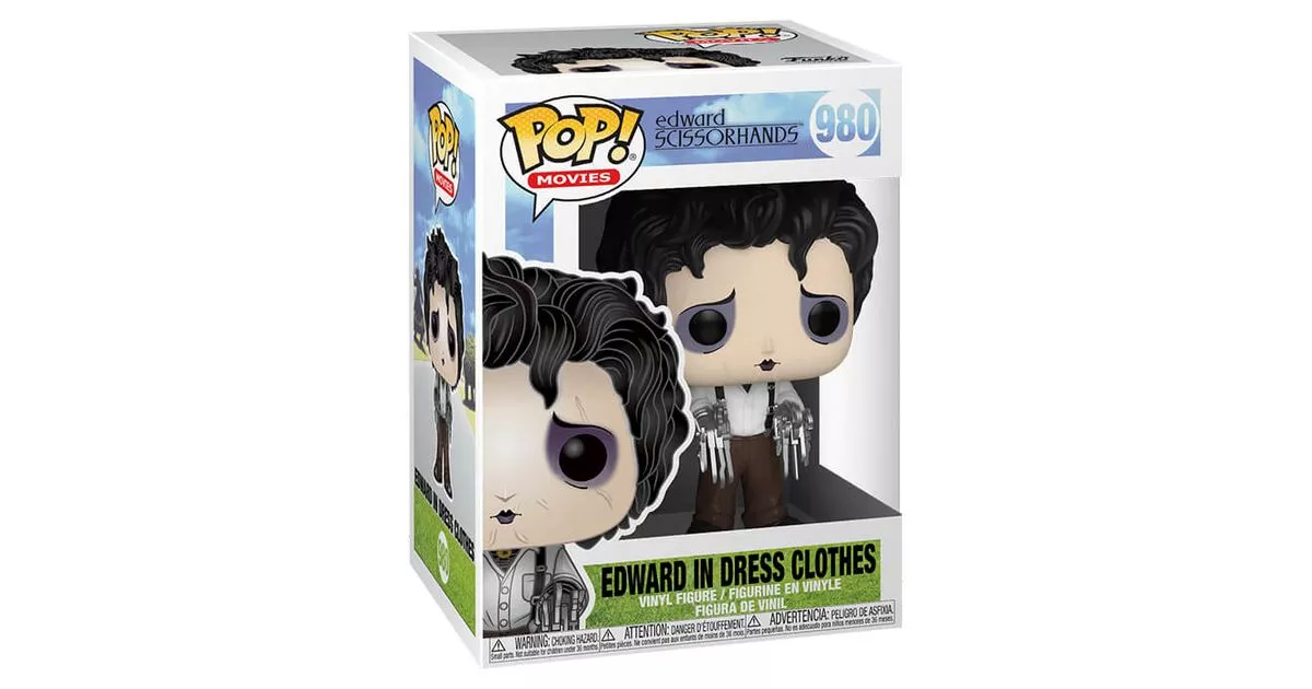 Edward is the central character in the 1990 film Edward Scissorhands directed by Tim Burton. The result of an inventor's creation, Edward was not finished and has blades and knives instead of hands. Having always lived in isolation, his physique is not the only atypical element since Edward's behaviour is also very strange!Edward integrates well into the community. Gathered by the Boggs family, he discovers friendship and gradually opens up. He falls completely in love with Kim, who, although she is rather afraid of him at first, ends up finding him endearing...Contrary to what one might think, Edward integrates thanks to his difference. He is soon solicited by the whole neighbourhood to trim the hedges, groom the animals and will even become the talented hairdresser that all the women are tearing out.Things get worse when Edward agrees, out of love for Kim, to rob her boyfriend's father's house. Edward is arrested by the police and the look on other people's faces changes him back to being abnormal...The drama occurs when Jim, jealous of Kim's love for Edward, decides to attack him. To protect Kim, Edward will end up killing Jim by stabbing him in the chest with his blade. To protect him in return, Kim will say that Edward also died in the struggle...Funko makes a nice nod to the film Edward Scissorhands by depicting him on in POP in the outfit given by Tinka, therefore with "normal" clothes (although dating from the time the story takes place!), which Edward puts on over his black suit with the greatest evil.On the POP figure, Edward is wearing the clothes borrowed from the family's father Bill Boggs. He's wearing a white shirt and oversized brown trousers that he holds on to with straps, the right one of which has been "patched up" after Edward has cut it!On Edward's POP, we can guess the young man, a little more smiling despite his sad look, proud to be wearing clothes for the first time. We find the "gothic" physique of the character played by Johnny Depp with his very pale face and his brown hair completely mismatched. Edward's hands are represented with iron blades and scissors of a shiny grey colour giving a very successful effect to the figurine.Finally, Funko did not omit any detail for this Edward's POP by representing the scars on the young man's face or by letting the black suit that can be guessed in the opening of the shirt appear.